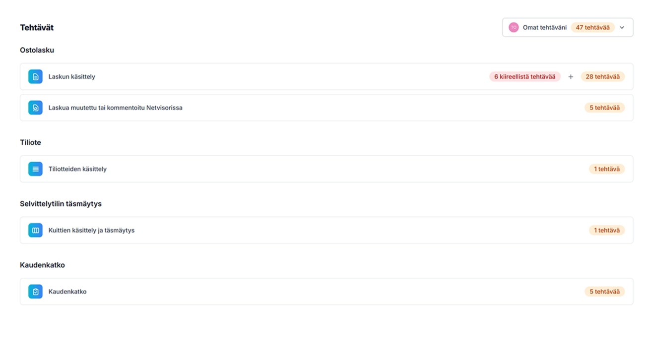 Netvisor PRO automatisoi taloushallintosi rutiinit – ostolaskut, kuitit, tiliotteet ja kauden katkot. Kun yhdistät sen Severan toiminnanohjaukseen, saat selkeän kuvan siitä, kuinka paljon aikaa ja rahaa automaatio todella säästää. Ei arvailuja, vaan luotettavaa dataa kannattavuutesi tueksi.